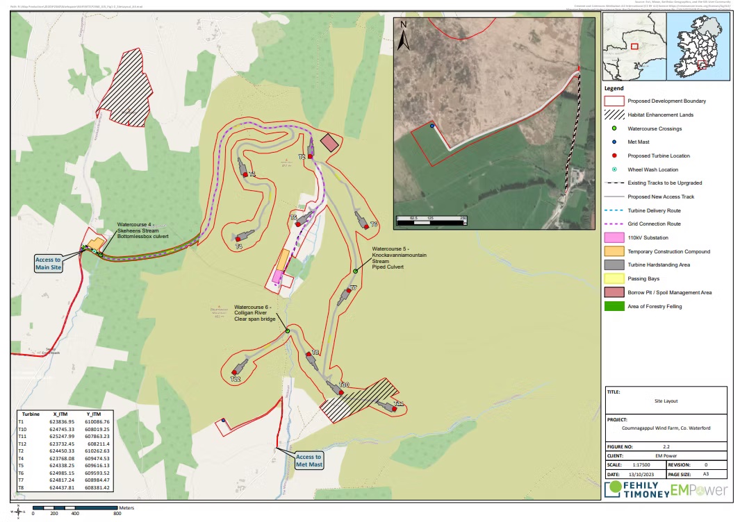 The proposed development area of Coumnagappul Wind Farm is located 16 km North of Dungarvan and 4km North of Kilbrien Village in County Waterford. The site was identified in the Waterford County Development Plan as a preferred area for wind development. The current application proposes a 10 turbine wind farm, at overall heights of 185 meters. This wind farm is estimated to generate enough clean, indigenous electricity to power approx. 39,000 Irish homes.