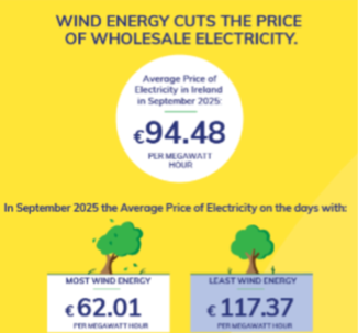 In September 2025, the average wholesale electricity price in Ireland was €94.48, but this fell to €62.01 on windy days and rose to €117.37 when we relied on imported fossil fuels.